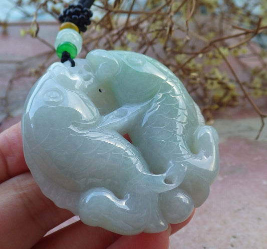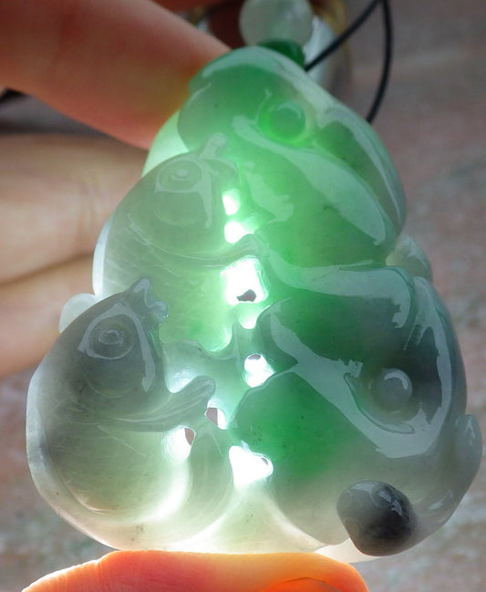 Certified Green Burma 100% Natural A Jade jadeite Pendant Fish Lotus Leaf Ruyi Necklace 年年有余 639639 TN