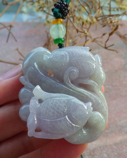 Certified Lavender Green Burma 100% Natural A Jade jadeite Pendant Fish Yuan Bao Necklace 年年有余 634285 TN