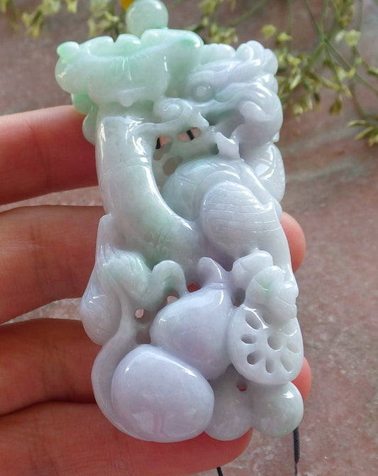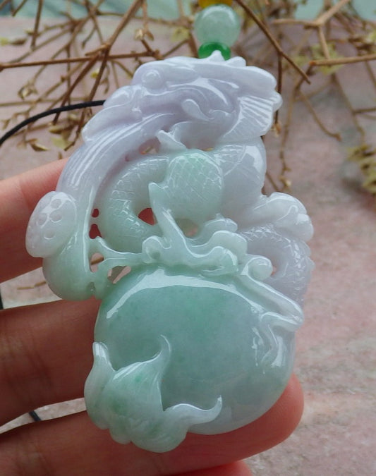 Certified Lavender Green Burma 100% Natural A Jade jadeite Pendant Flying Dragon Necklace 生意兴隆 649381 TN