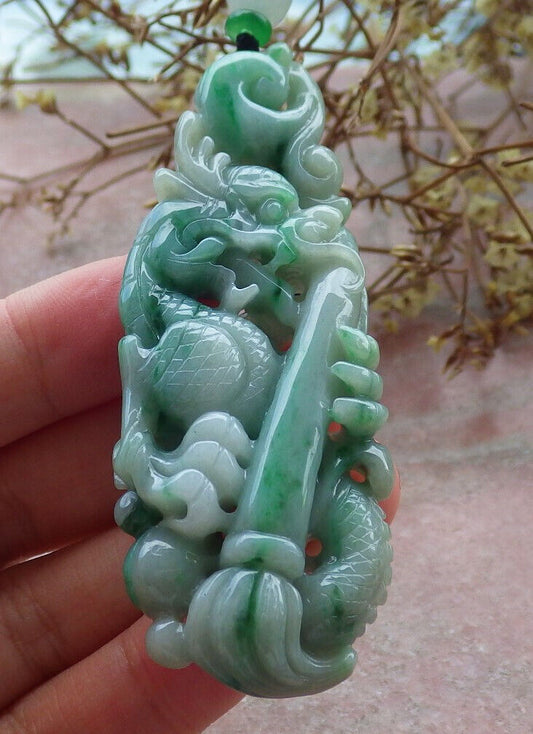 ertified Green Burma 100% Natural A Jade jadeite Pendant Dragon Pen Lotus Flower Necklace 生意兴隆 632975 TN