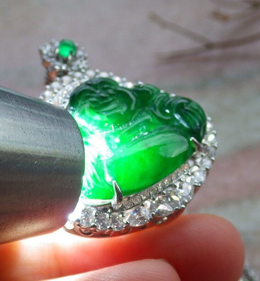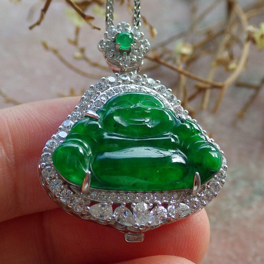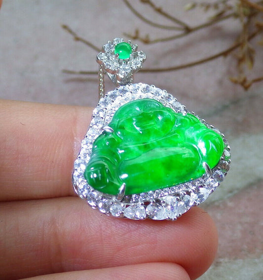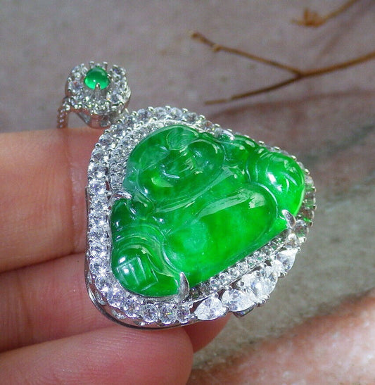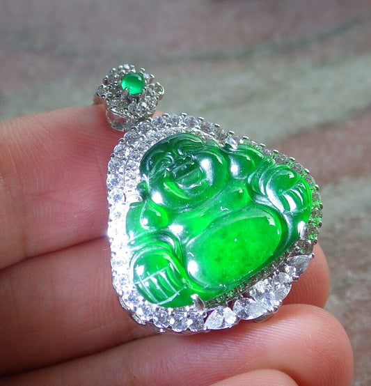 Icy Green Silver 925 Certified Burma 100% Natural A JADE Jadeite pendant Happy Buddha God Necklace 佛公 635107 TN