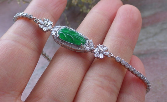 Green Silver 925 Certified A JADE Jadeite Bead Leaf Bracelet Bracelet Diamond Imitation 645616 TN