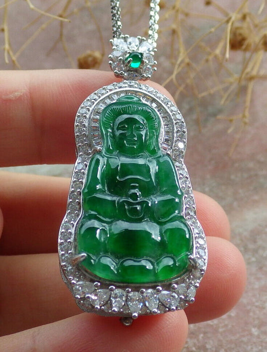 Sterling Silver 925 Certified Icy Green Burma 100% Natural A JADE Jadeite pendant Guanyin Kwan Yin Lotus Flower Necklace 观音 636112 TN