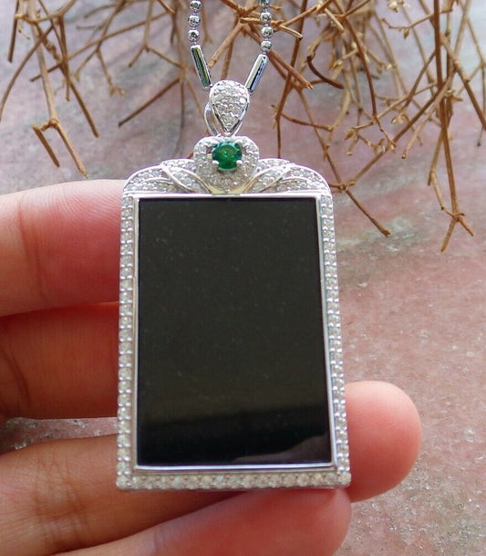 Silver 925 Certified 100% Natural A JADE Jadeite pendant Black Green Rectangle Necklace 墨翠 522868 **include 18 inches metal Chain** The small diamonds is Diamond (Imitation) TN