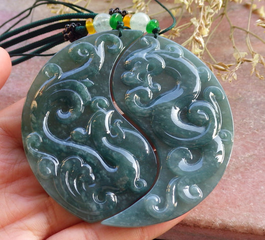 Pair Certified Icy Green Burma 100% Natural A Jade jadeite Pendant Dragon Phoenix Necklace 龙凤 649244 TN