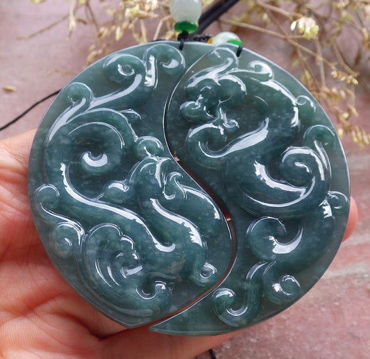 Pair Certified Icy Green Burma 100% Natural A Jade jadeite Pendant Dragon Phoenix Necklace 龙凤 650858 TN