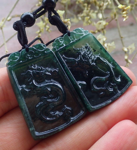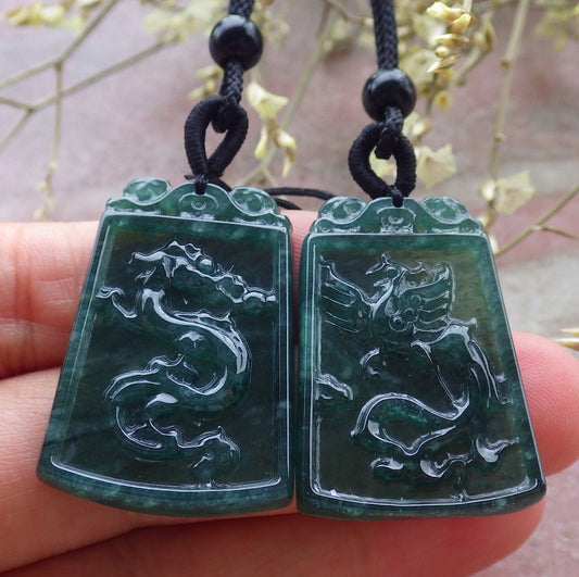 Pair Certified Icy Green Burma 100% Natural A Jade jadeite Pendant Dragon Phoenix Necklace 龙凤 641311 TN