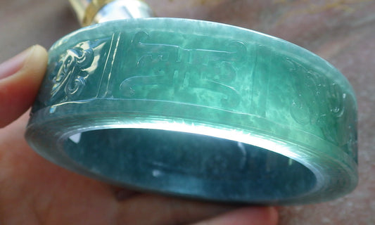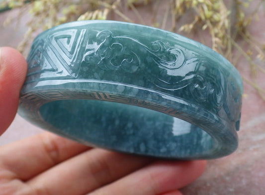 Certified Icy Green Burma 100% Natural A JADE Jadeite Dragon Phoenix Longevity Bangle Bracelet 57 mm 手镯 641353 TN