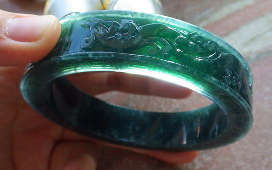 Certified Icy Green Burma 100% Natural A JADE Jadeite Dragon Phoenix Longevity Bangle Bracelet 63 mm 手镯 647894 TN