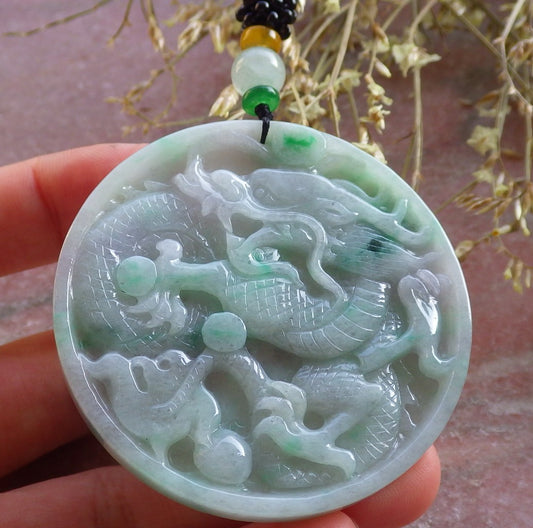 Certified Green Pale Lavender Burma 100% Natural A Jade jadeite Pendant Dragon Bead Necklace 生意兴隆 641075 TN