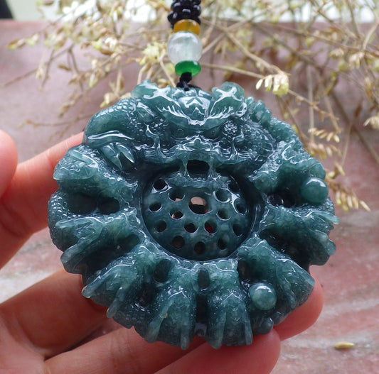 Certified Green Burma 100% Natural A Jade jadeite Pendant 9 Dragon Buddha God Circle Necklace 640771 TN