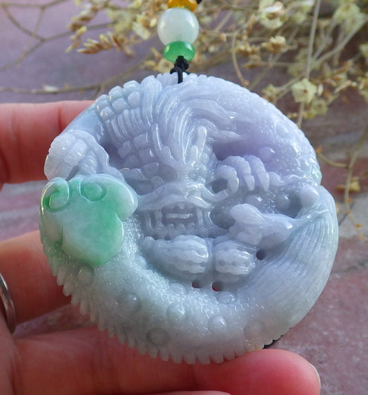 Certified Icy Green Pale lavender Burma 100% Natural A Jade jadeite Pendant Dragon Phoenix Heart Necklace 龙凤 650607 TN