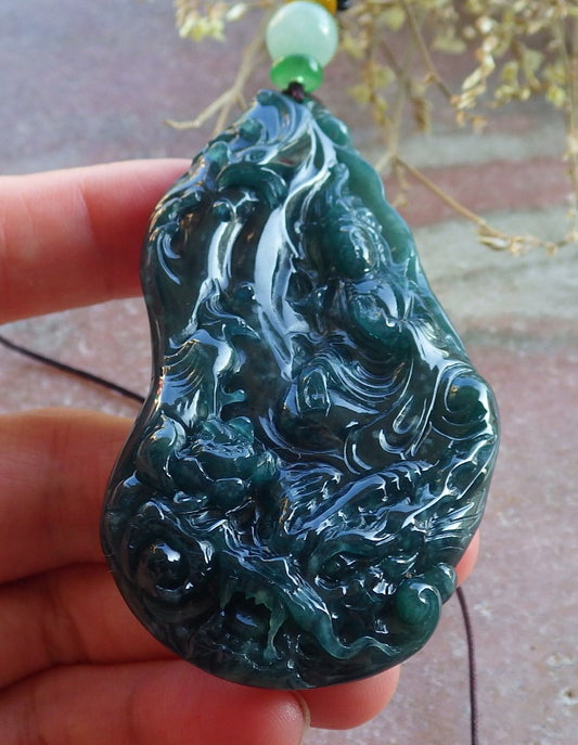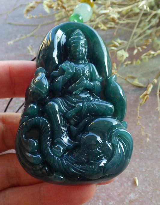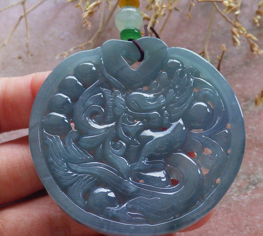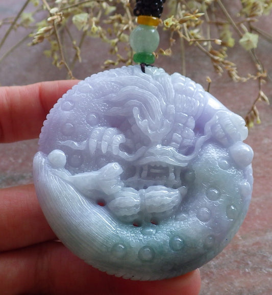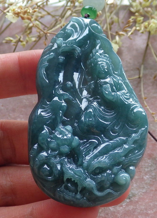 Certified Icy Green Burma 100% Natural A Jade jadeite Pendant Guanyin Kwan Yin Dragon Phoenix Lotus Flower 龙凤 650635 TN