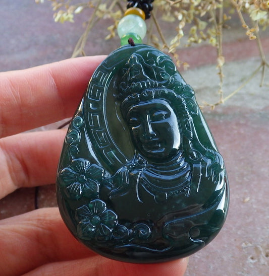 Certified Icy Green Burma 100% Natural A Jade jadeite Pendant Guanyin Kwan Yin Flower Necklace 观音 650396 TN