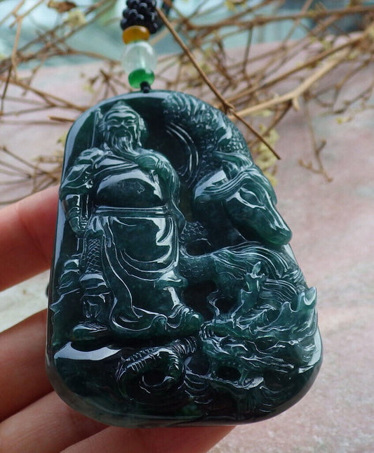 Certified Icy Green Burma 100% Natural A Jade jadeite pendant Guan Gong God Dragon Horse Sword Necklace 关公 635214 TN