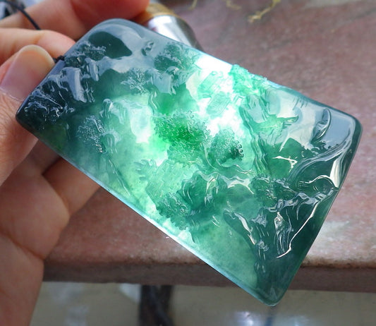Certified Icy Green Burma 100% Natural A Jade jadeite Landscape painting Tree Necklace Necklace 山水画 649025 TN