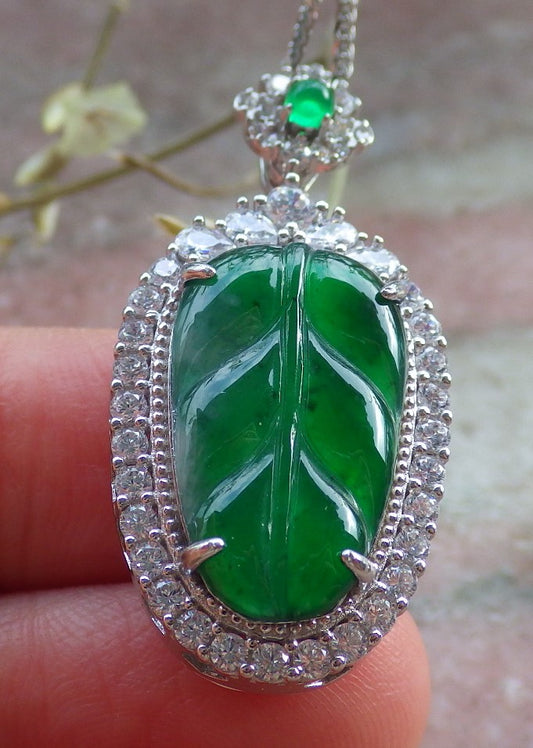 Icy Green Silver 925 Certified BURMA 100% Natural A JADE Jadeite pendant Leaf Necklace 事业有成 649422 TN