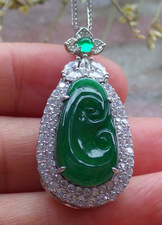 Icy Green Silver 925 Certified Burma 100% Natural A JADE Jadeite pendant Lotus Flower Ruyi Necklace 如意649444 TN