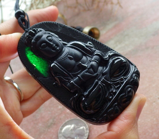 Certified Green Black 100% Burma Natural A Jade jadeite pendant Guanyin Kwan Yin Lotus Flower Necklace 墨翠 观音 518658 TN