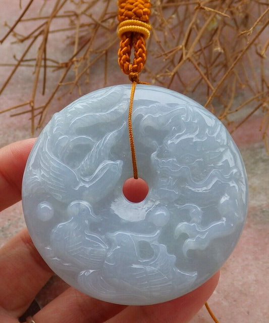 Certified Pale Green Lavender 100% Natural A Jade jadeite Dragon Phoenix 5 Bat Necklace 五福龙凤 519611 TN