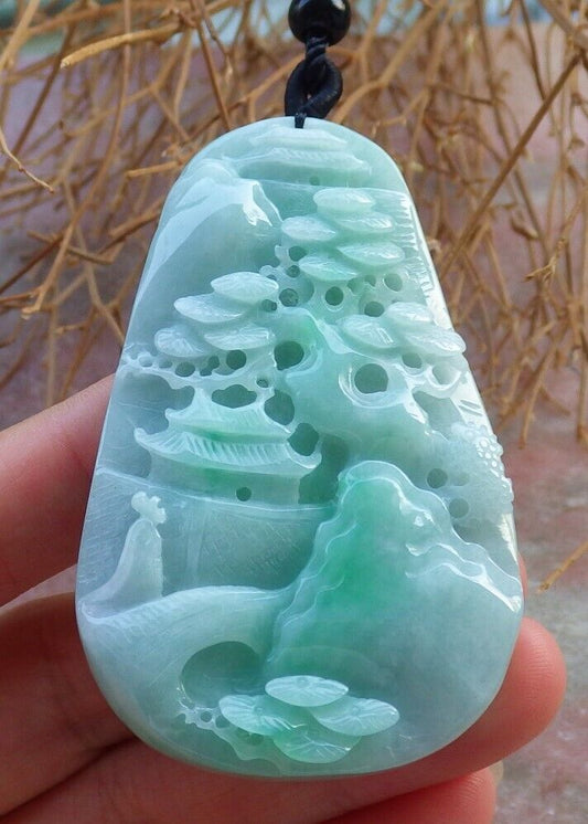 Certified Green 100% Natural A Jade jadeite Landscape painting Tree Necklace Necklace 山水画 519550 TN