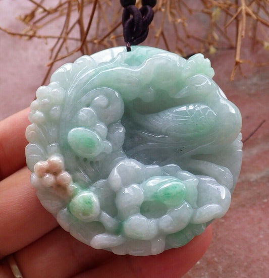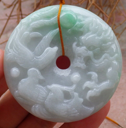 Certified Green 100% Natural A Jade jadeite pendant Mandarin Duck Dragon Phoenix 5 Bat Necklace 龙凤 519621 TN