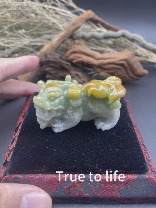 Certified Yellow Green Burma 100% Natural A Jade jadeite Display Dragon Pi Xiu Money Coin Lotus Flower Ruyi 风水貔貅 498174 TN